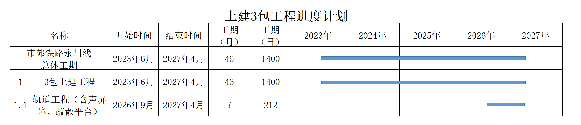 市郊铁路重庆中心城区至永川线工程计划施工总工期60个月。本招标项目计划于2023年6月30日开工,计划1400日历天按合同约定实施和完成本承包工程。