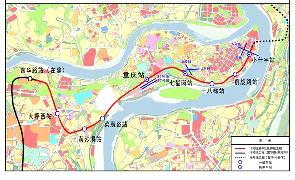 18号线北延伸段(富华路~小什字)全长11公里,投资100亿元,设大坪西站、黄沙溪站、菜袁路站、重庆站、七星岗站、十八梯站、凯旋路站、小什字站共8座车站。18号线为重庆市轨道交通线网中的西南-东北向的骨干线路,强化了城市核心区的快速联系。18号线北延伸段为中心城区加密线,与18号线相接,有效缓解化龙桥、大坪、菜园坝等片区交通拥堵,填补了渝中半岛下半城的轨道空白。